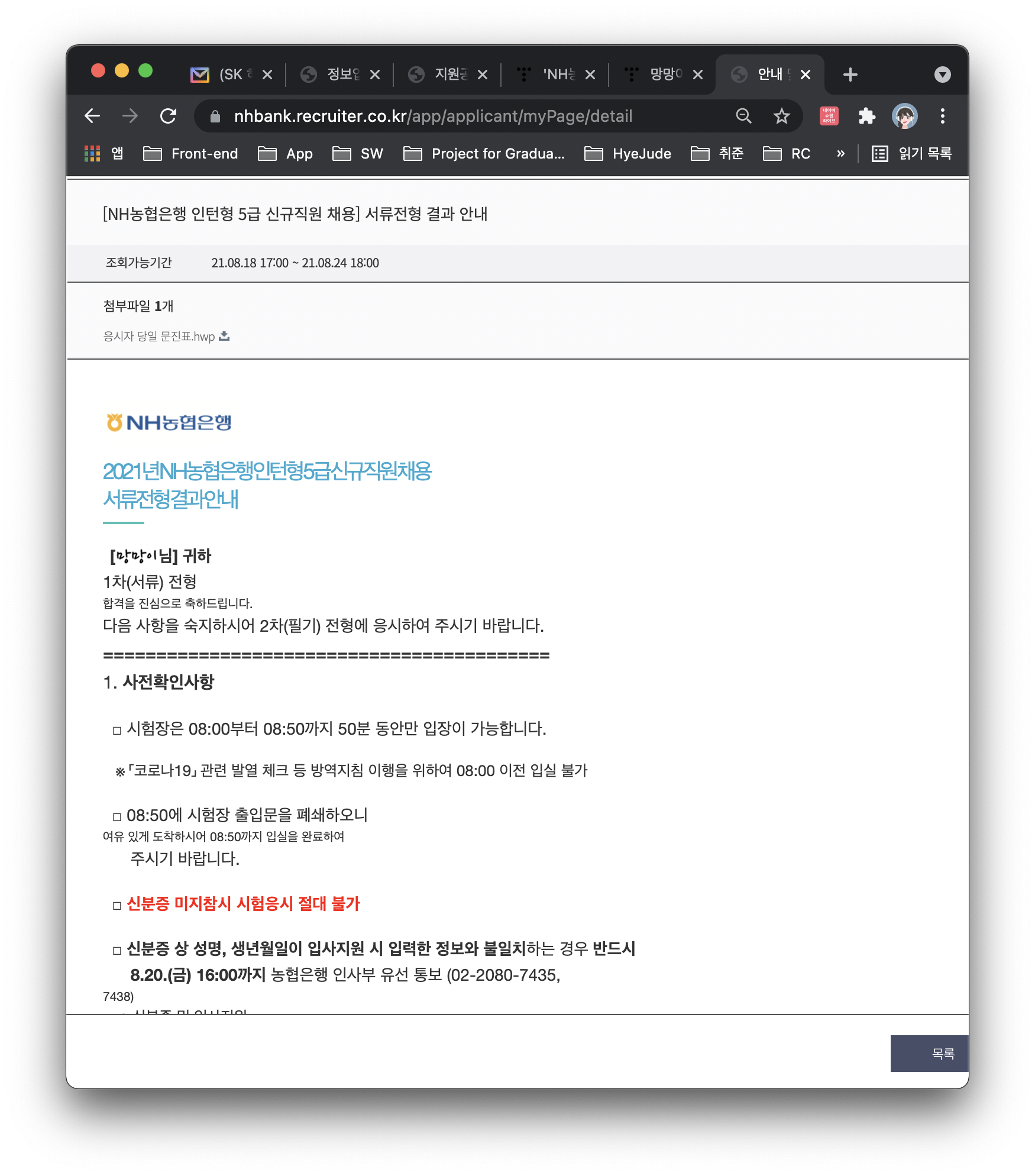 은준이라고 해도 은행 준비할거면 우리/신한 쪽으로 준비를 하지... 농협 전형보고 이제 와서 하는 소리지만 진짜 없는 정 떨어지더라 ^^..